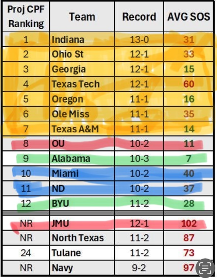 The top 7 (only 1 loss) would be in (Yellow). The next 6 would play each other for three spots – OU vs JMU, Bama vs BYU & Notre Dame vs Miami. Then the remaining spots would be filled with non Power 4 Teams playing each other.